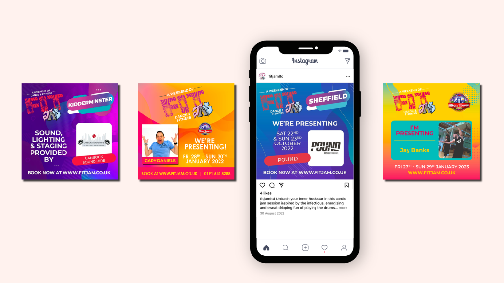 I work closely with FitJAM to provide ongoing creative support, to supply all collateral needed to run the event. From initial concept through to promotional material like flyers, social media graphics, banners and backdrops.